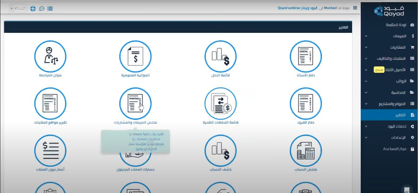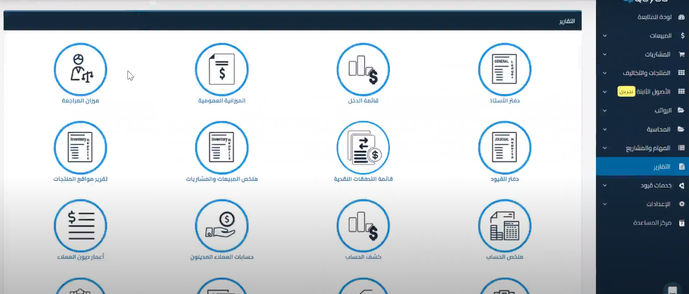 - الوصول إلى التقارير: ابدأ بالضغط على قسم “التقارير” في واجهة برنامج قيود.