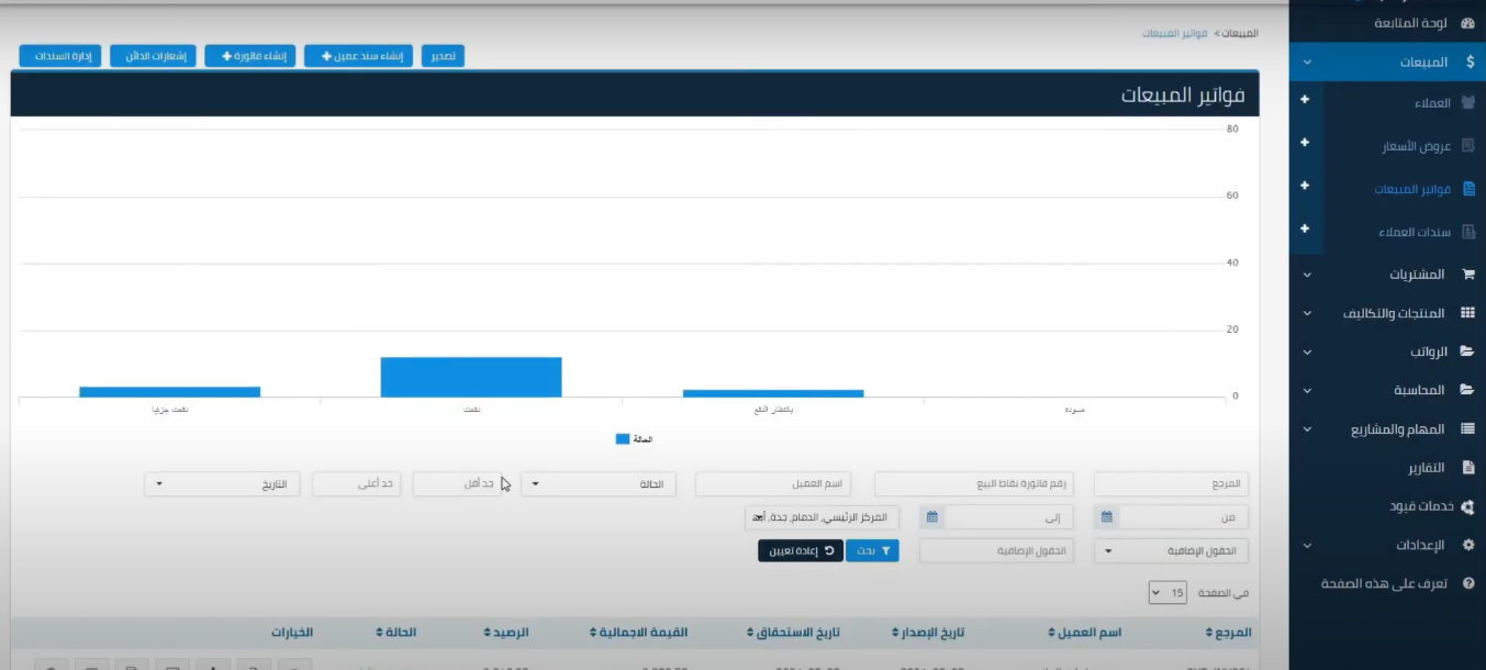 - الرسم البياني: لتصنيف الفواتير حسب حالتها (دفعت جزئيًا، دفعت، موافق عليها …).