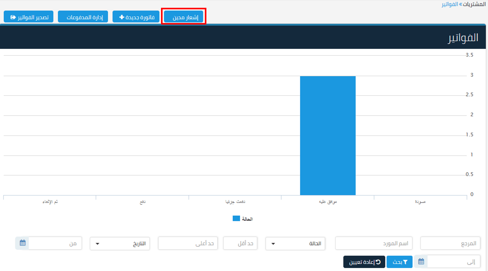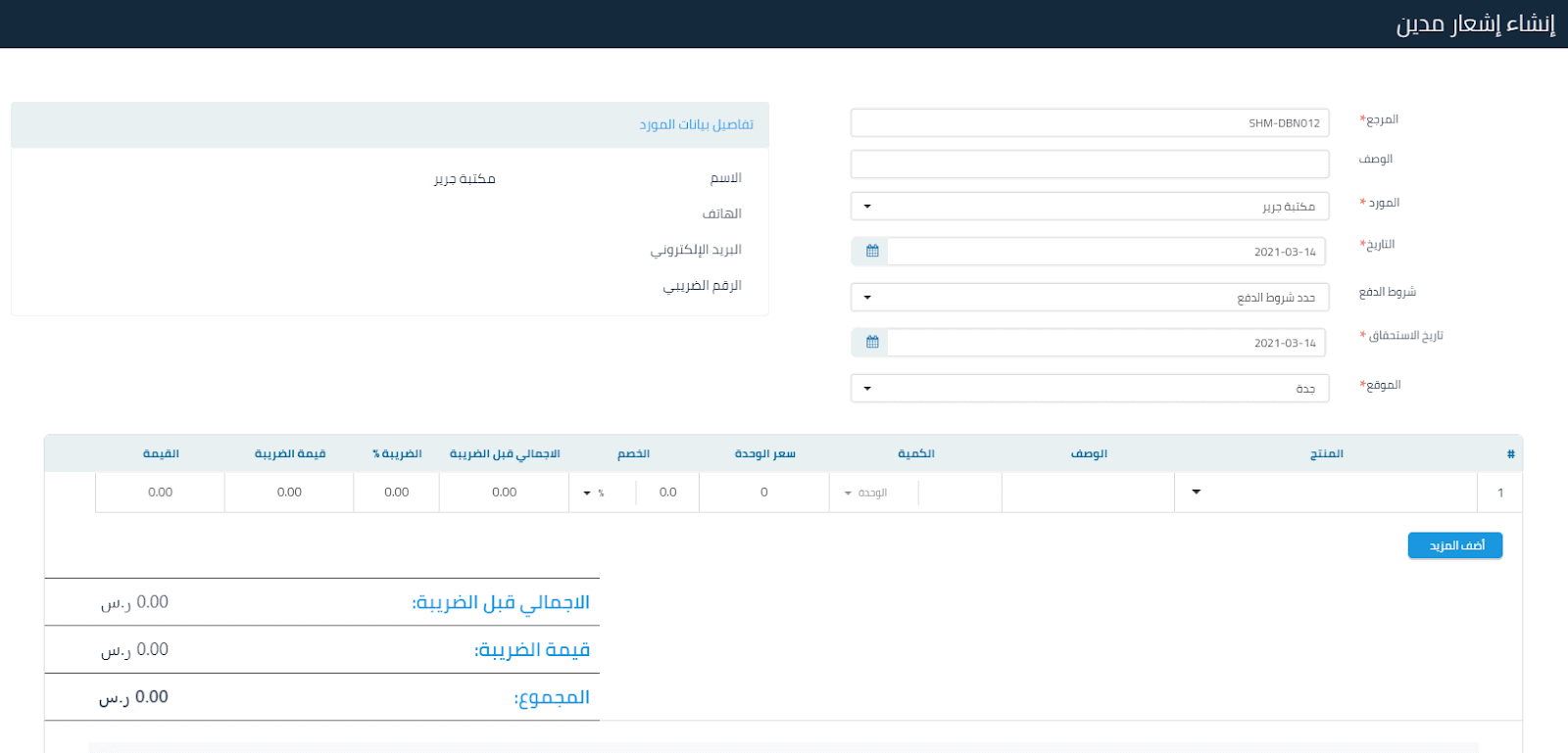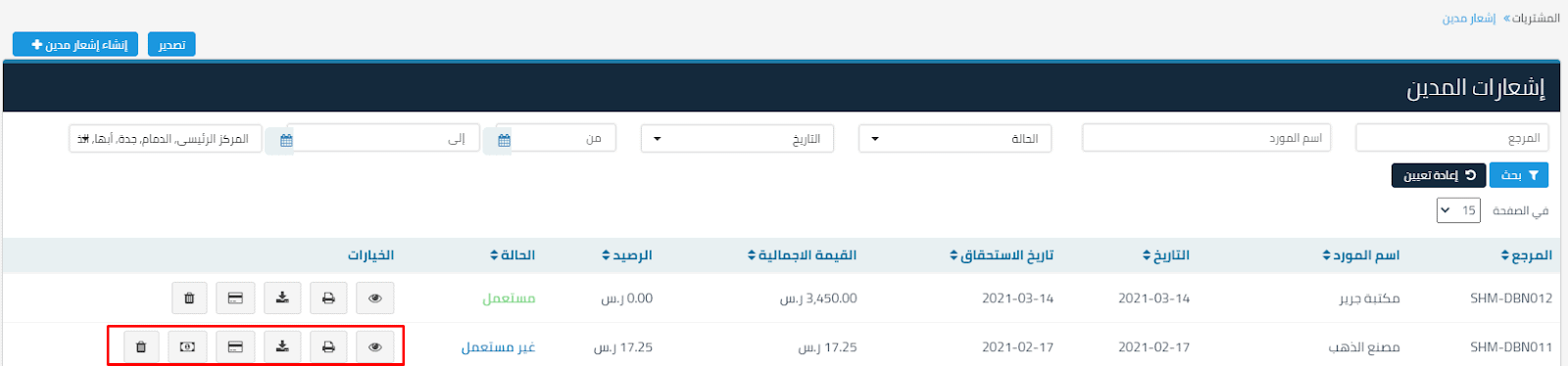 • من خلال صفحة إشعار مدين، يمكنك إضافة إشعار مدين من خلال أيقونة “إنشاء إشعار مدين” كما هو موضح في الصورة أدناه.