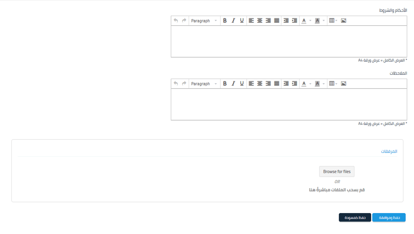 • تتوفر ميزة إضافة الشروط والأحكام والملاحظات الخاصة بك. و باستطاعتك أيضًا رفع مرفق خاص بالفاتورة مثل الصورة الأساسية للفاتورة؛ لحفظها وعدم الاحتفاظ بها ورقيًا.