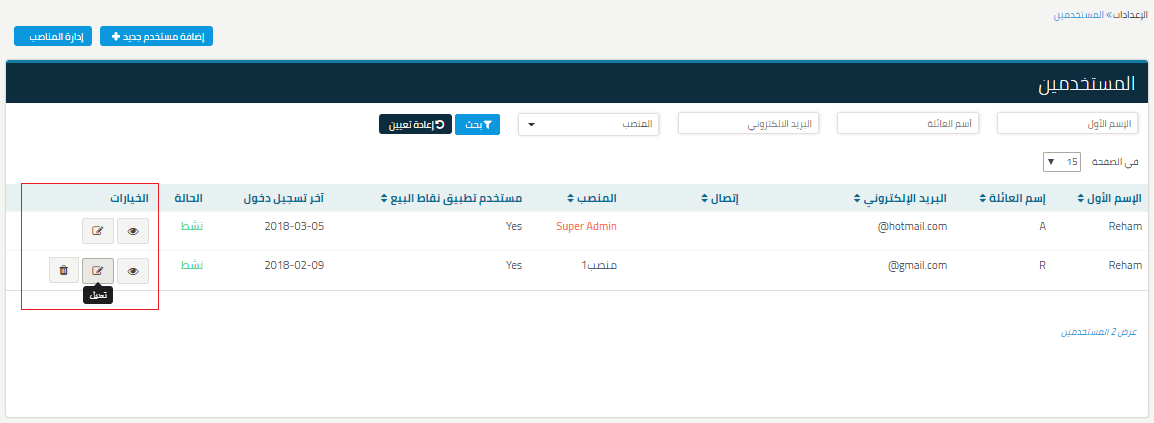 بعد ذلك ستظهر لك صفحة خاصة بالمستخدمين الذين تمت إضافتهم في قيود بالإضافة للمستخدم الأساسي، أمام كل مستخدم ستجد أيقونات العرض والتعديل والحذف، بالضغط على أيقونة التعديل ستنتقل إلى “تعديل المستخدم”.