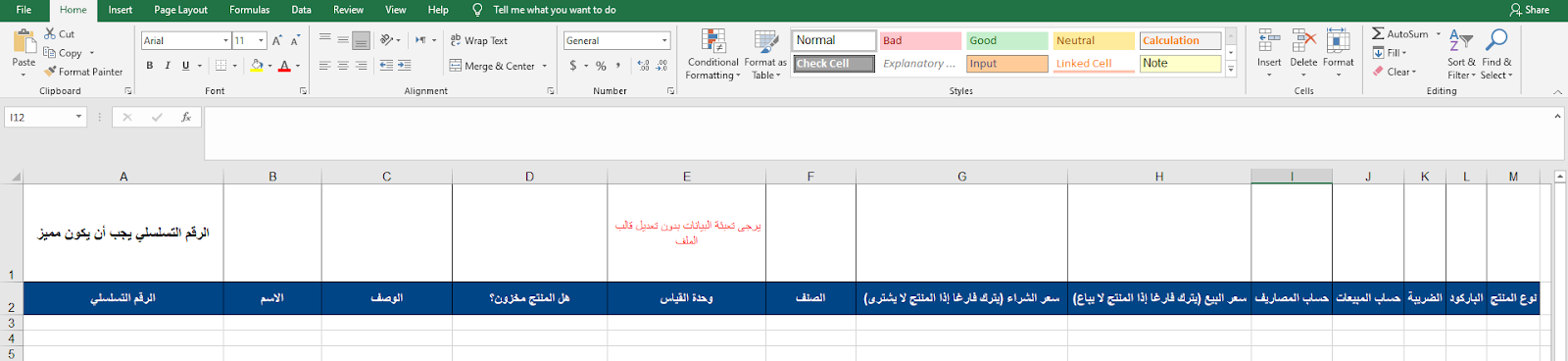 تتم تعبئة كافة تفاصيل المنتجات في ملف الإكسل بناءً على البنود المذكورة، مع ضرورة الالتزام بالأعمدة في ملف الإكسل لأن أي عملية حذف من شأنها أن تؤثر على عملية الاستيراد.