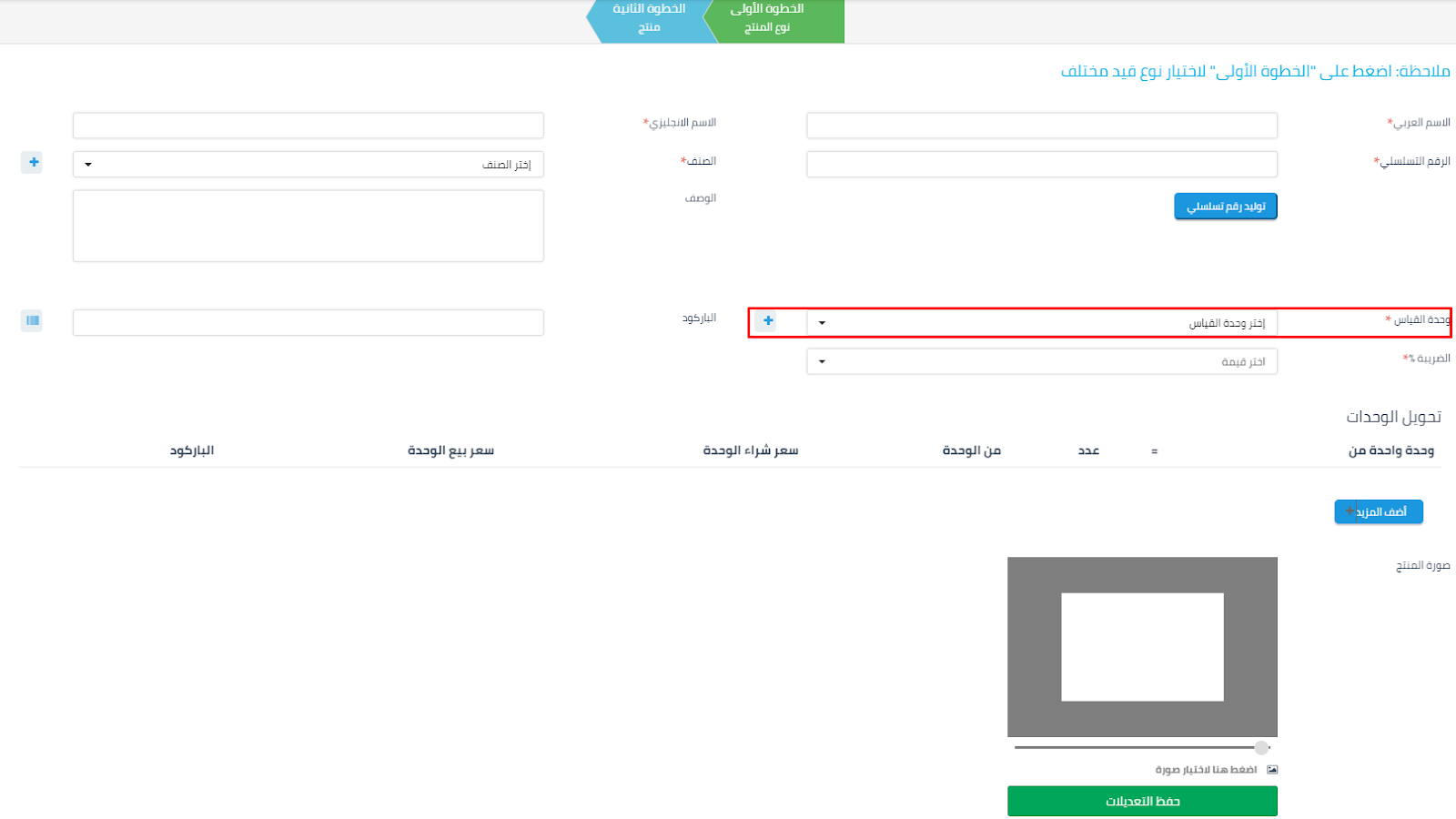 يمكنك تحديد وحدة القياس من القائمة، كما يمكنك إضافة وحدة قياس جديدة بالضغط على علامة (+) ثم إدخال الوحدة الجديدة والضغط على حفظ. كما تستطيع الاطلاع على جميع الوحدات وحذفها أو تعديلها من خلال إدارة الوحدات