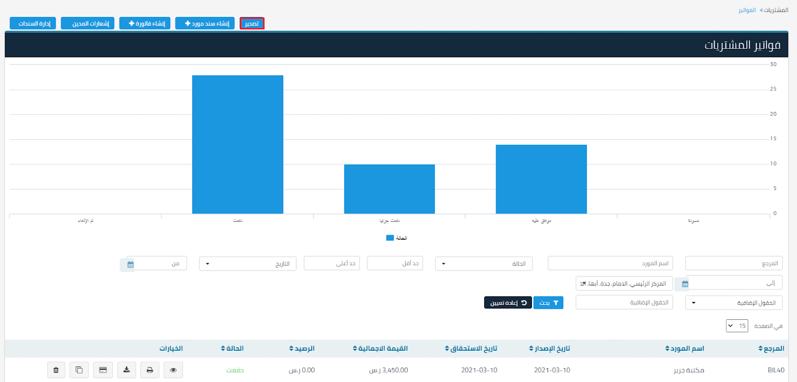 ويمكنك القيام بذلك من خلال الضغط على أيقونة “تصدير” والموجودة في الصفحة الرئيسية لفواتير المشتريات.