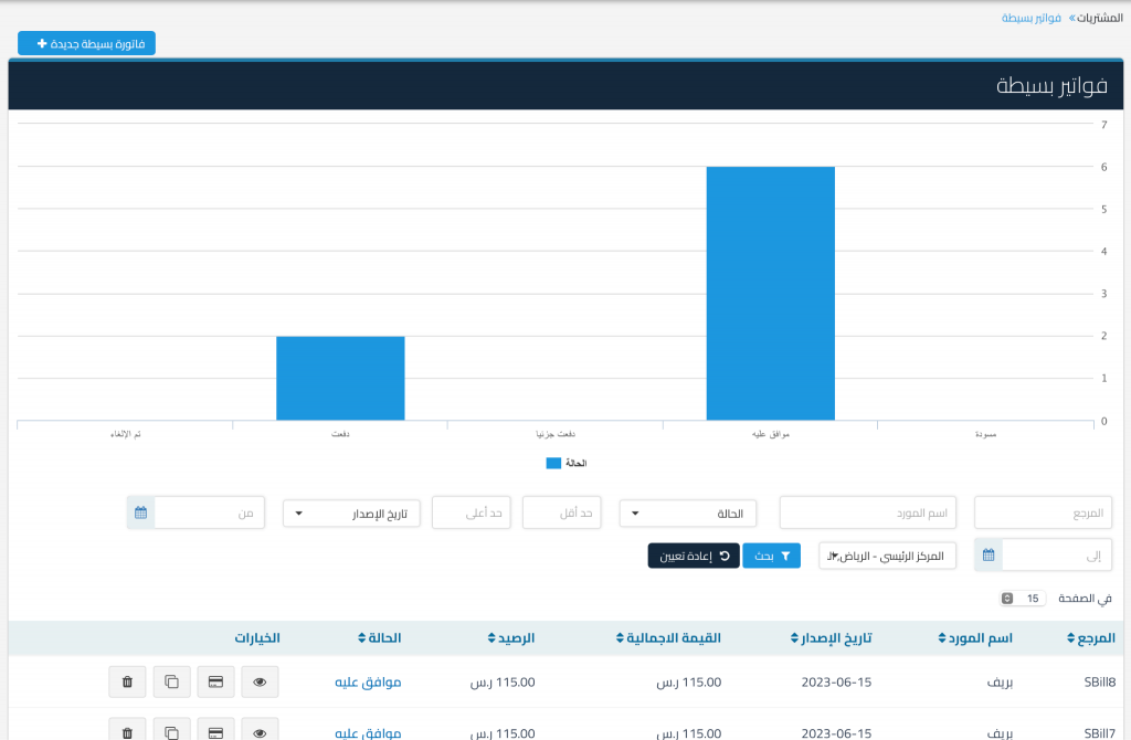 • عرض: للاطلاع على تفاصيل الفاتورة البسيطة.