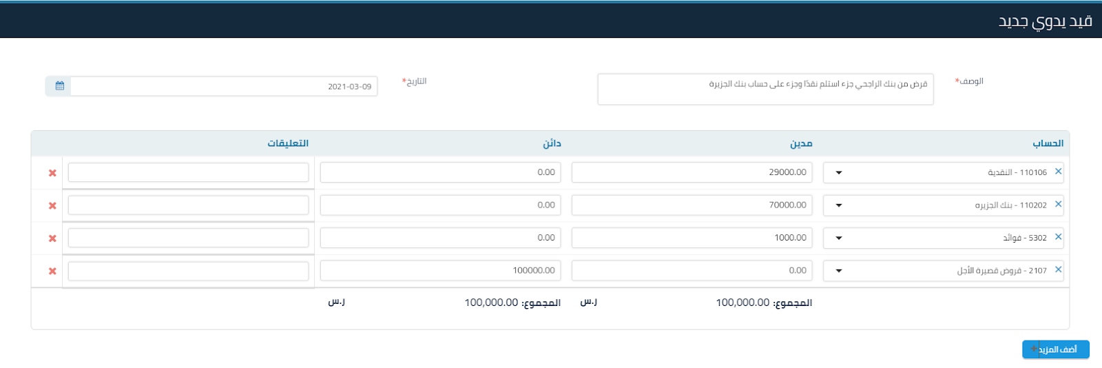 - في حال توفر فائدة للقرض (مثلاً 10%) ستتمكن من إضافة حساب “فوائد قروض” أو “مصاريف قروض” وكتابة المبلغ (10% من مبلغ القرض) تحت خانة “المدين”.