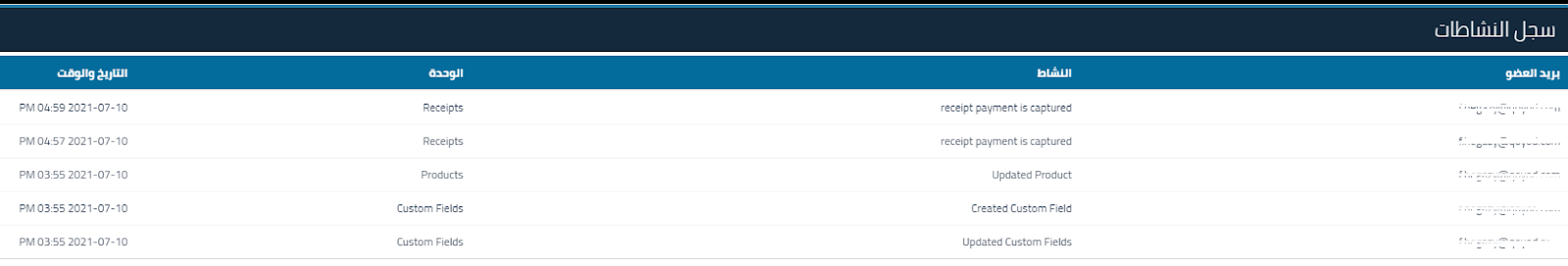 يوضح سجل النشاطات تفاصيل آخر العمليات التي تم القيام بها كل مستخدم.