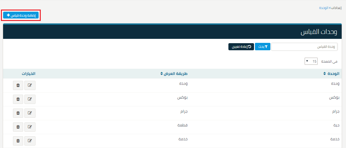 3- من خلال الضغط على أيقونة “إضافة وحدة قياس” الموجودة في أعلى يسار الشاشة ستتمكن من إضافة وحدة قياس جديدة.